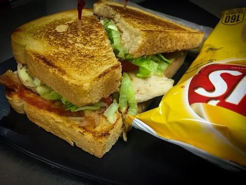 grilled chicken breast on a grilled croissant with lettuce, tomato & mayo