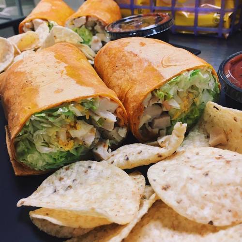 shredded lettuce, tomatoes, cucumbers, black olives, cheese, avocado spread, bell pepper & ranch dressing; served in a tomato basil wrap with baked lays & pickle spear on the side